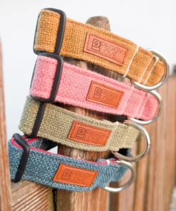 Coleira em tecido com fecho em plástico e argola soldada.